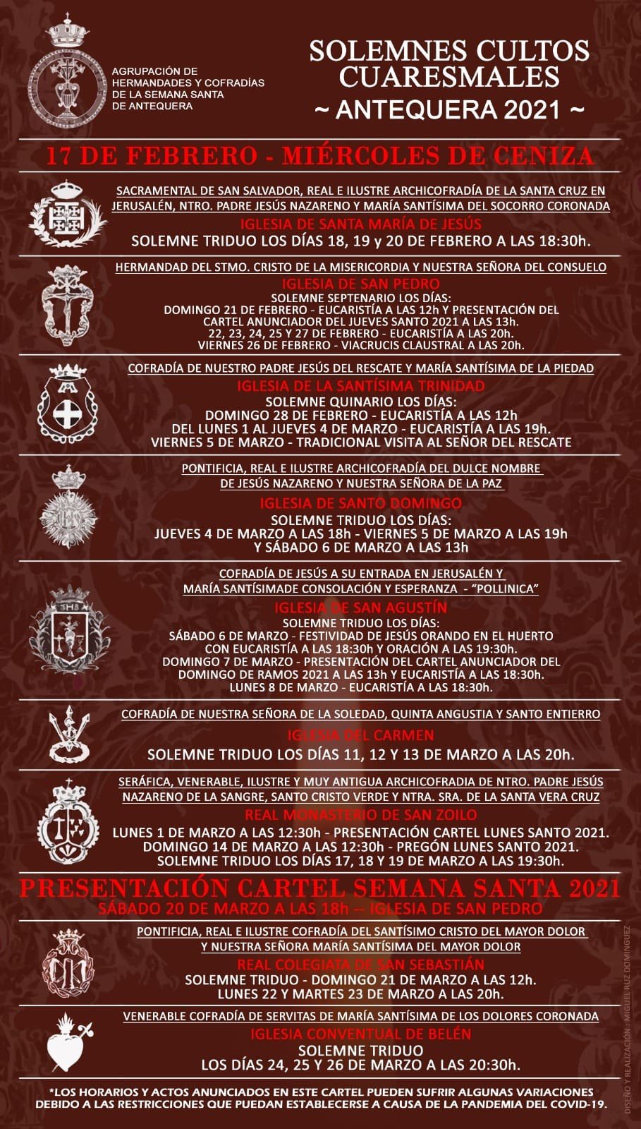 Será un calendario, el de este año, diferente al de otros a causa de la pandemia. Es por ello, que indican que los horarios y actos anunciados podrían sufrir algunas variaciones dependiendo de las restricciones que puedan establecerse debido a la situación sanitaria actual. No obstante, a primera vista, las cofradías han decidido modificar en su mayoría sus horarios o días tradicionales de celebración, apostando por un adelanto horario de los mismos para una mayor facilidad de asistencia ante el toque de queda y horarios de cierres de servicios.