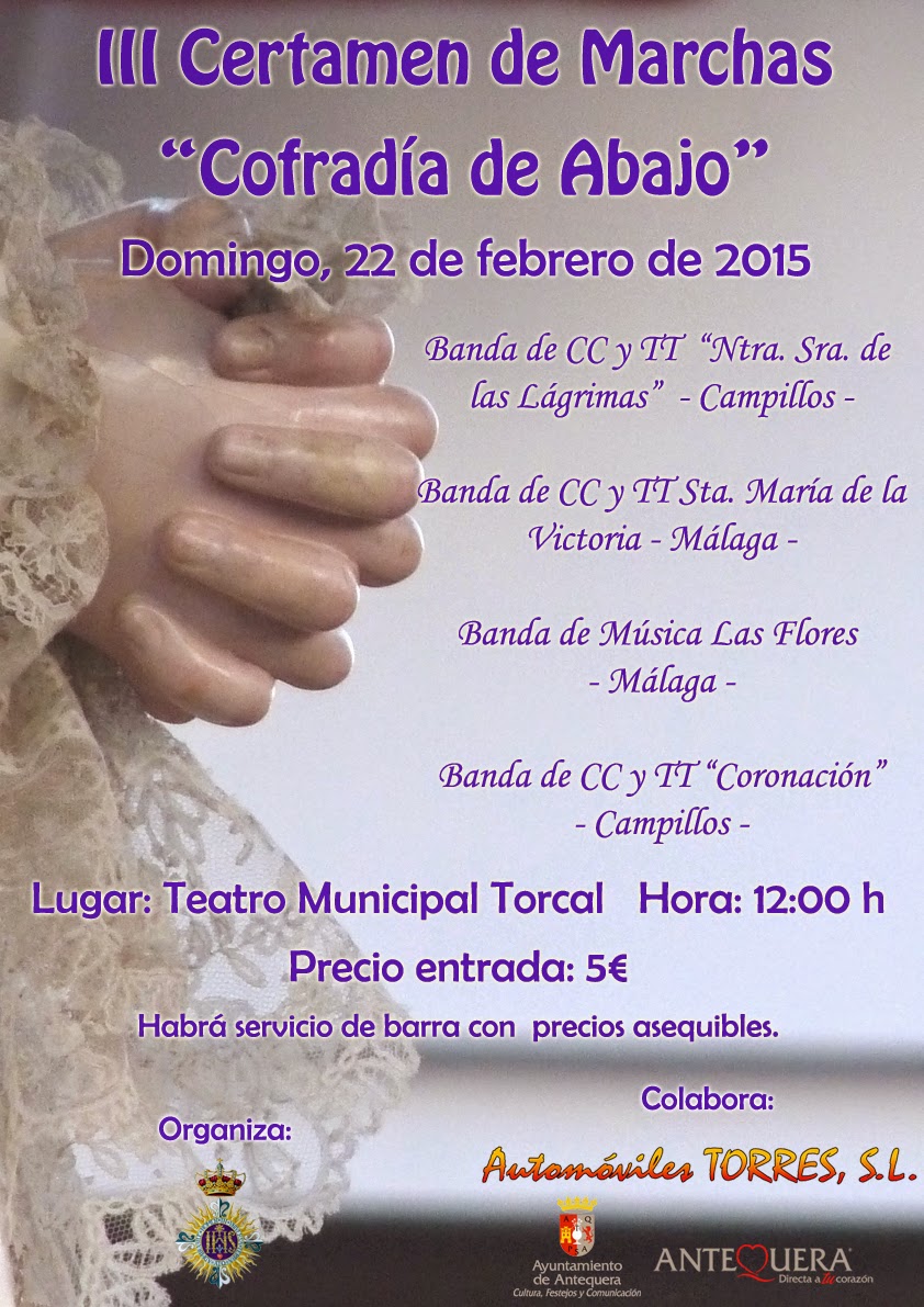 Antequera volverá a contar en la Cuaresma de 2015 con Certamen de Bandas donde sonaran marchas procesionales, se trata de la tercera edición de este certamen que organiza la Archicofradía de Abajo.