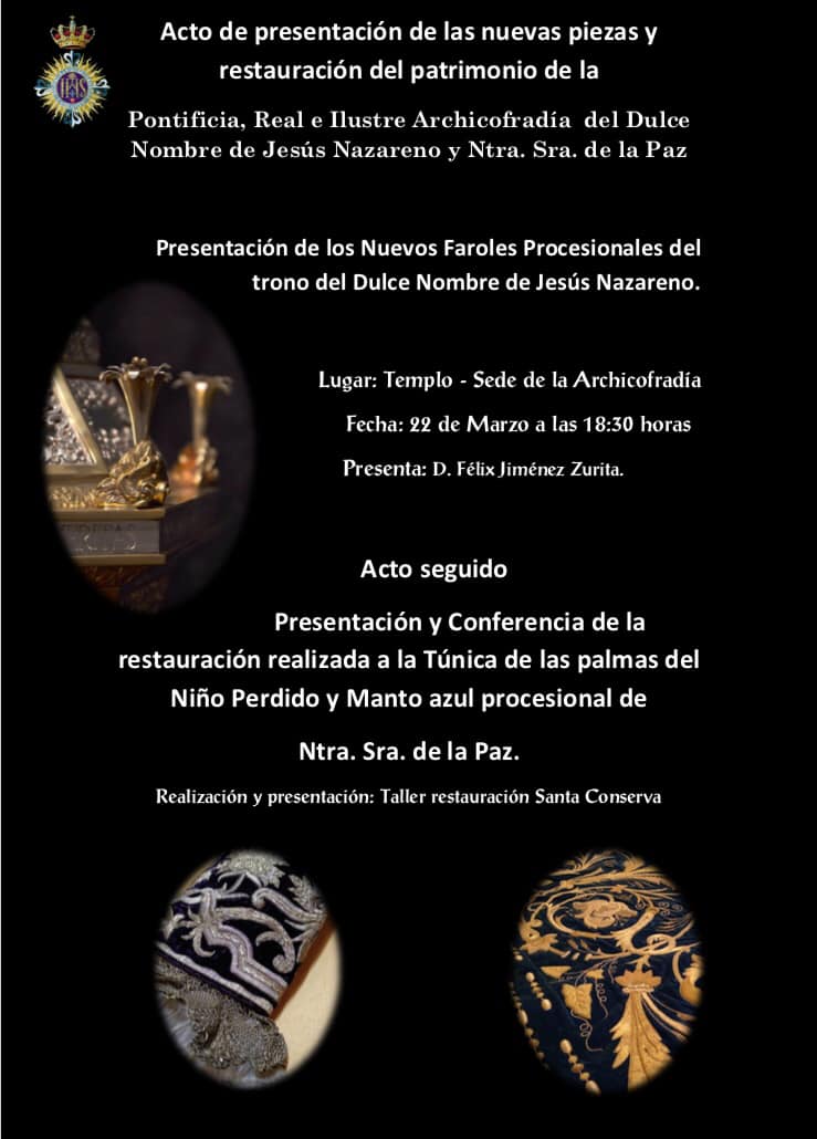 Acto seguido, tendrá lugar la presentación y conferencia de la restauración realizada a la túnica de las palmas del Niño Perdido y del manto azul procesional de Nuestra Señora de la Paz. La presentación correrá a cargo de los propios realizadores de dicho trabajo, siendo el Taller de Restauración Santa Conserva.