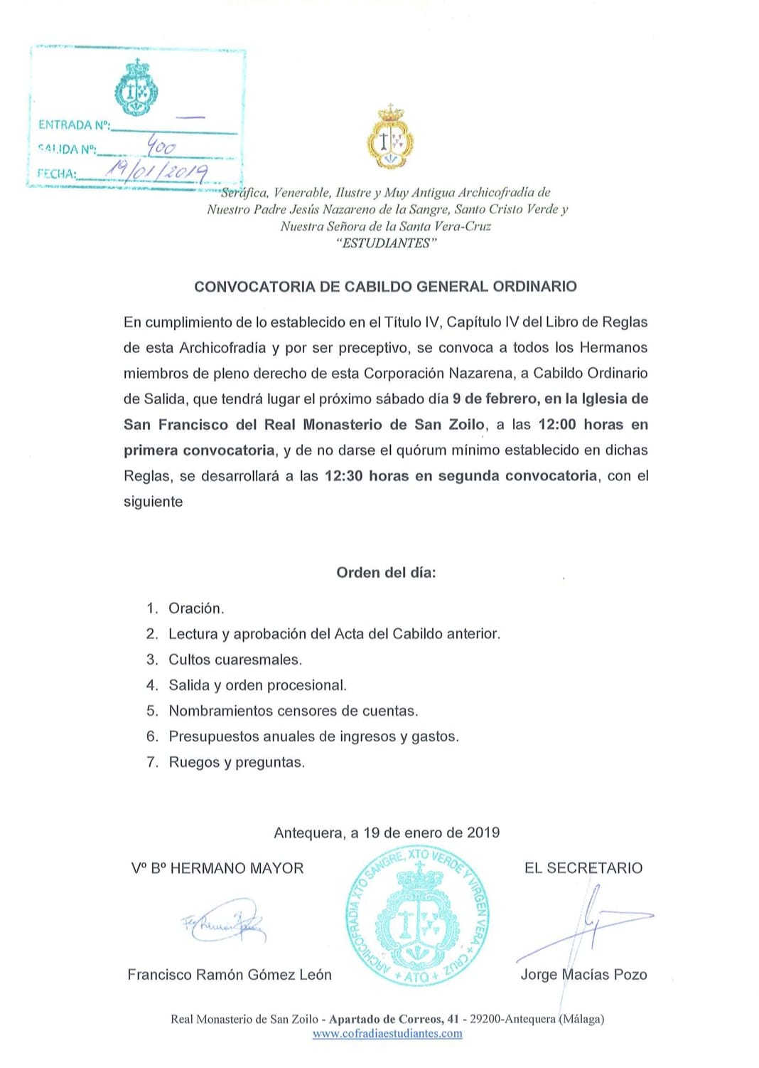 La Archicofradía de los Estudiantes de Antequera convoca a sus cofrades a Cabildo General Ordinario, que tendrán lugar según rigen sus Estatutos el próximo sábado 9 de febrero en la iglesia de San Francisco, a las 12.00 horas en primera convocatoria y a las 12.30 horas en segunda.