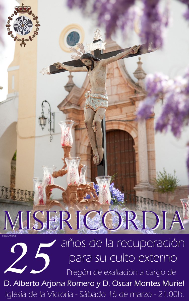 La Archicofradía del Dulce Nombre de Archidona organiza para el sábado 16 de marzo a las 21:00 horas en la iglesia de la Victoria el pregón exaltación para conmemorar los 25 años que lleva procesionándose el Santísimo Cristo de la Misericordia después de décadas sin hacerlo.
