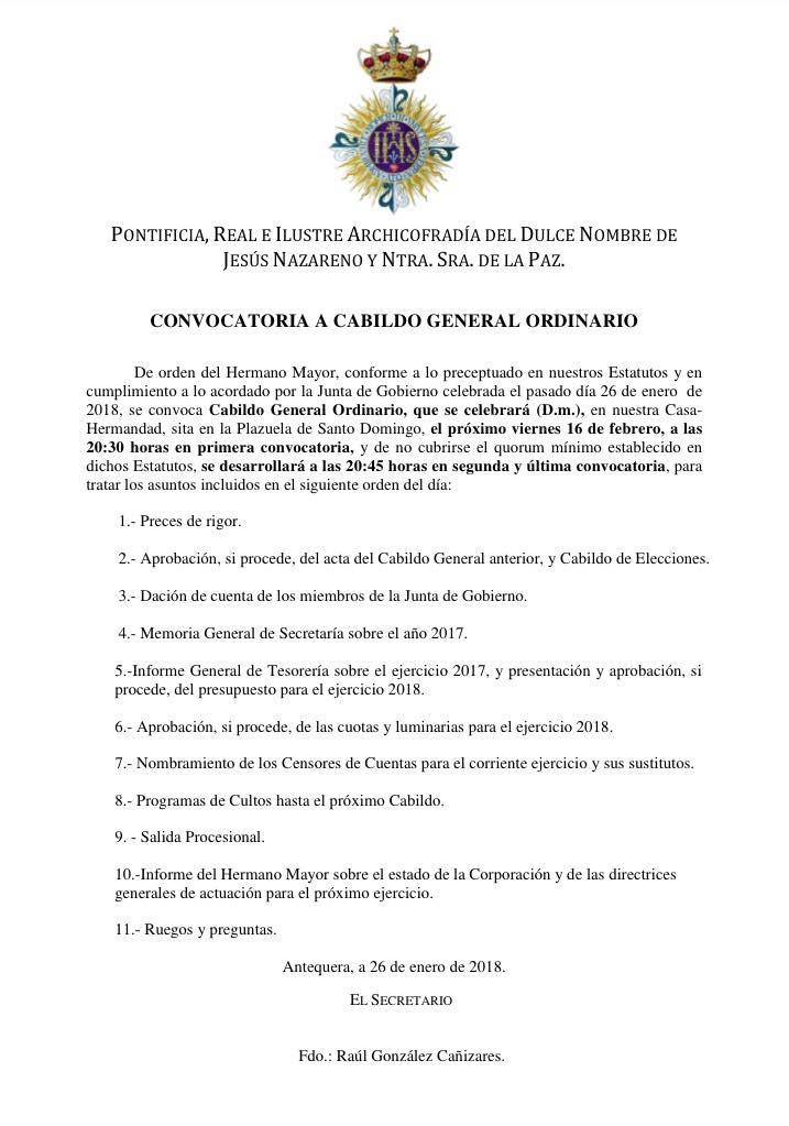 La Archicofradía del Dulce Nombre de Jesús Nazareno y Nuestra Señora de la Paz de Antequera convoca a sus hermanos cofrades a Cabildo General Ordinario, que se celebrará el viernes 16 de febrero de 2018 a las 20.30 horas en primera convocatoria y a las 20:45 horas en segunda y última convocatoria, en la Casa- Hermandad, en la Plazuela de Santo Domingo.