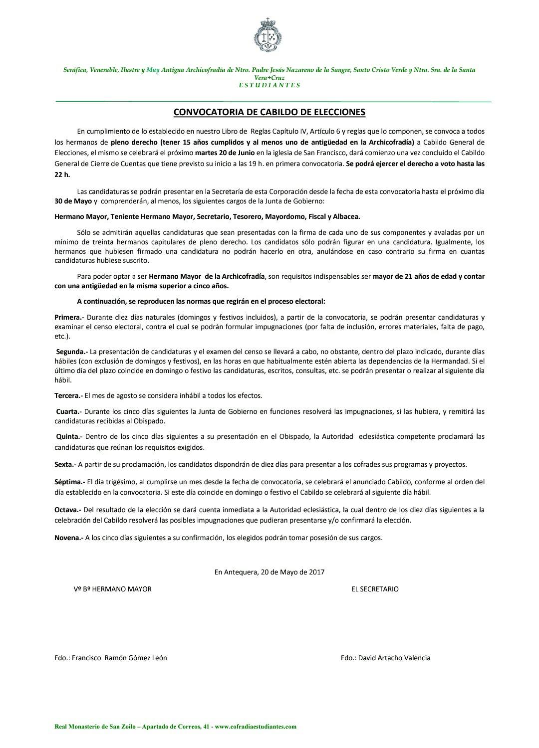 En cumplimiento de lo establecido en Libro de Reglas Capítulo IV, Artículo 6 y reglas que lo componen, se convoca a todos los hermanos de pleno derecho (tener 15 años cumplidos y al menos uno de antigüedad en la Archicofradía) a Cabildo General de Elecciones, el mismo se celebrará el próximo martes 20 de Junio en la iglesia de San Francisco, dará comienzo una vez concluido el Cabildo General de Cierre de Cuentas que tiene previsto su inicio a las 19 h. en primera convocatoria. Se podrá ejercer el derecho a voto hasta las 22 h.