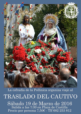 La Cofradía de la Pollinica de Antequera organiza viaje al Traslado del Cautivo que tendrá lugar el sábado 19 de Marzo, con salida a las 7.30 horas de la mañana desde la Plaza Castilla. El precio por persona es de 7,50 euros. Para apuntarse, llamar al número 682 253 812. De esta forma, la Cofradía del Domingo de Ramos de Antequera continúa trabajando para el proyecto de restauración de sus tronos.