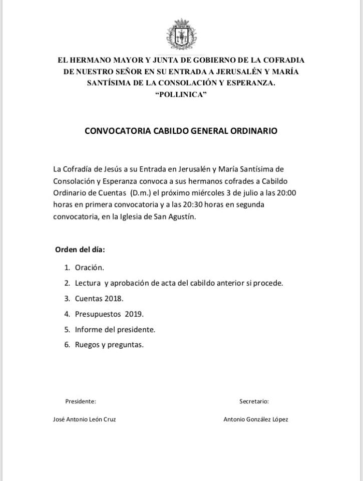 La Cofradía de Jesús a su Entrada en Jerusalén y María Santísima de Consolación y Esperanza de Antequera convoca a sus hermanos a Cabildo Ordinario de Cuentas el próximo miércoles 3 de julio a las 20.00 horas en primera convocatoria y a las 20.30 horas en segunda, en la iglesia de San Agustín.