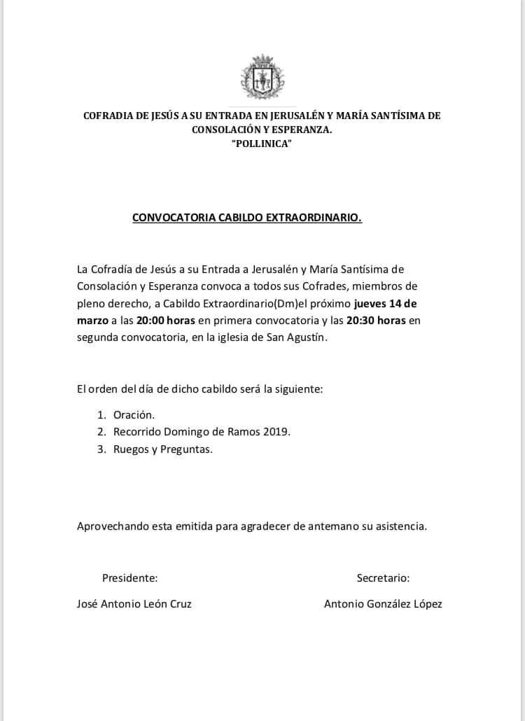 El orden del día de dicho cabildo será el siguiente Oración, Recorrido Domingo de Ramos 2019 así como ruegos y preguntas.