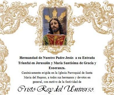 La Hermandad de Nuestro Padre Jesús a su Entrada Triunfal en Jerusalén y María Santísima de Gracia y Esperanza de Campillos celebra este domingo, día 25 de noviembre, la conmemoración de Cristo Rey con solemne Eucaristía en honor a su Sagrado Titular.