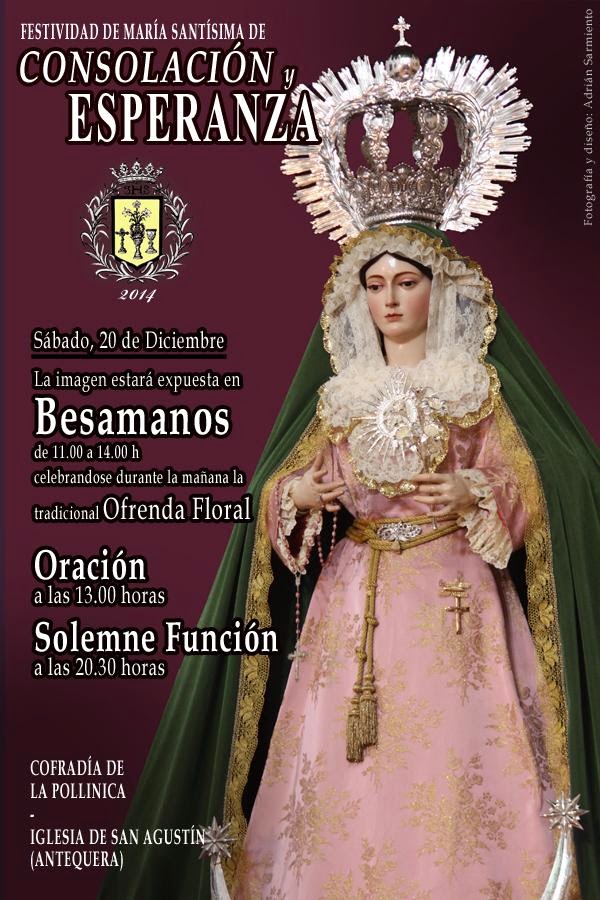 La Cofradía de la Pollinica de Antequera organiza los siguientes cultos con motivo de la Festividad de su Sagrada Titular, Nuestra Señora de Consolación y Esperanza, para el próximo sábado 20 de Diciembre, en el interior de su templo sede, la Iglesia de San Agustín: