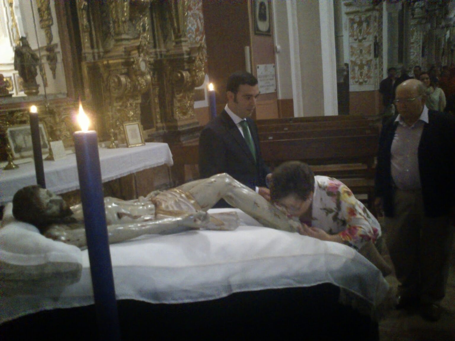Tras la función Eucarística, los asistentes pudieron acercarse hasta el Cristo Yacente para besar sus pies, para lo cual la imagen estuvo durante la celebración trasladada en los pies del Altar Mayor colocado bajo escolta de 4 hachones al pie de una cruz y dos faroles. Para la ocasión, también la Cofradía ha decidido cambiar la vestimenta de Nuestra Señora de la Soledad encontrándose desde el pasado viernes ataviada de luto en su capilla.