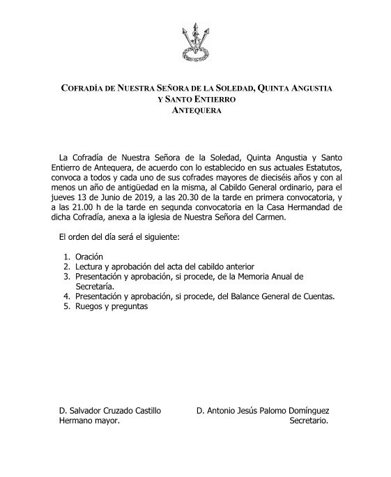 La Cofradía de Nuestra Señora de la Soledad, Quinta Angustia y Santo Entierro de Antequera, de acuerdo con lo establecido en sus actuales Estatutos, convoca a todos y cada uno de sus cofrades mayores de dieciséis años y con al menos un año de antigüedad en la misma, al Cabildo General ordinario.