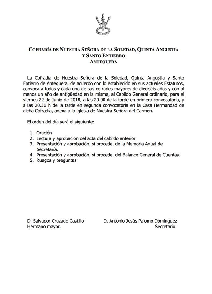 La Cofradía de Nuestra Señora de la Soledad, Quinta Angustia y Santo Entierro de Antequera convoca Cabildo General de Cuentas y Memoria el próximo viernes 22 de junio