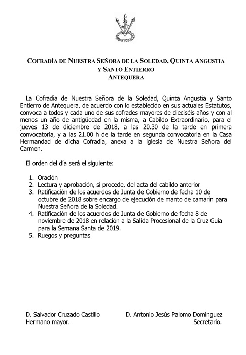 La Cofradía de Nuestra Señora de la Soledad, Quinta Angustia y Santo Entierro de Antequera, de acuerdo con lo establecido en sus actuales Estatutos, convoca a todos y cada uno de sus cofrades mayores de dieciséis años y con al menos un año de antigüedad en la misma, a Cabildo Extraordinario, para el jueves 13 de diciembre de 2018, a las 20.30 de la tarde en primera convocatoria, y a las 21.00 h de la tarde en segunda convocatoria en la Casa Hermandad de dicha Cofradía, anexa a la iglesia de Nuestra Señora del Carmen.