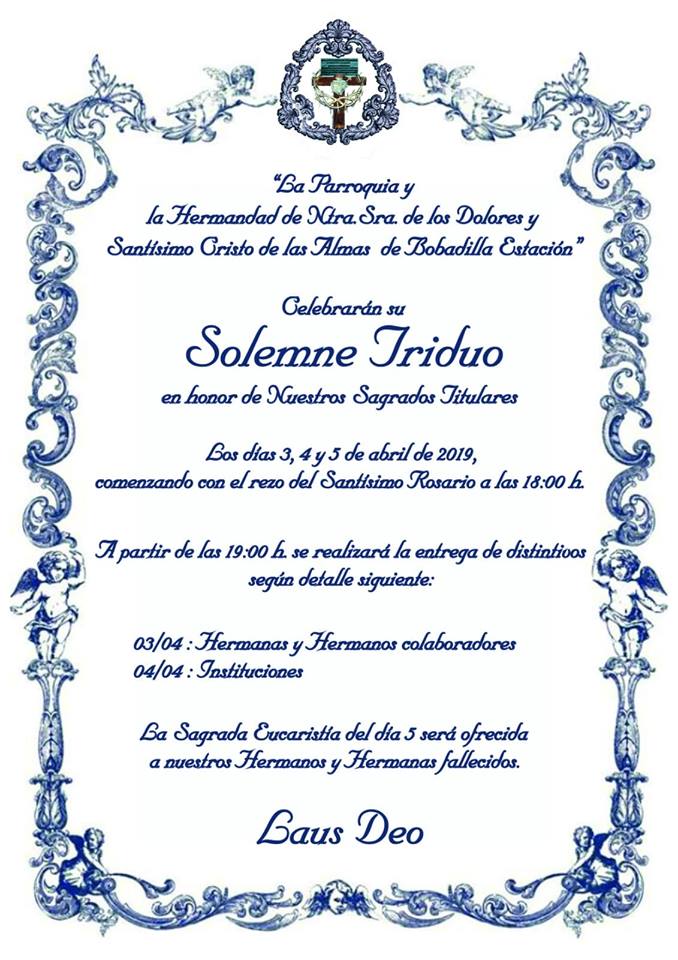 La parroquia y Hermandad de Nuestra Señora de los Dolores y Cristo de las Almas de Bobadilla Estación celebran esta semana su Triduo en honor a sus Sagrados Titulares. Desde este miércoles 3 al viernes 5 de abril.