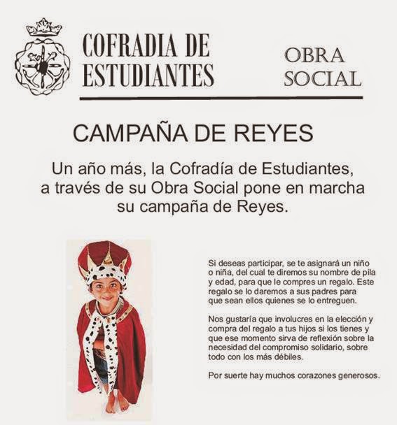 Un año más, la Cofradía de Estudiantes de la provincia de Málaga, a través de su Obra Social pone en marcha su campaña de Reyes. Si deseas participar se les asignará un niño o niña del cual dirán su nombre de pila y edad para que le compres un regalo. Este regalo se le dará a sus padres para que sean ellos quienes se lo entreguen.