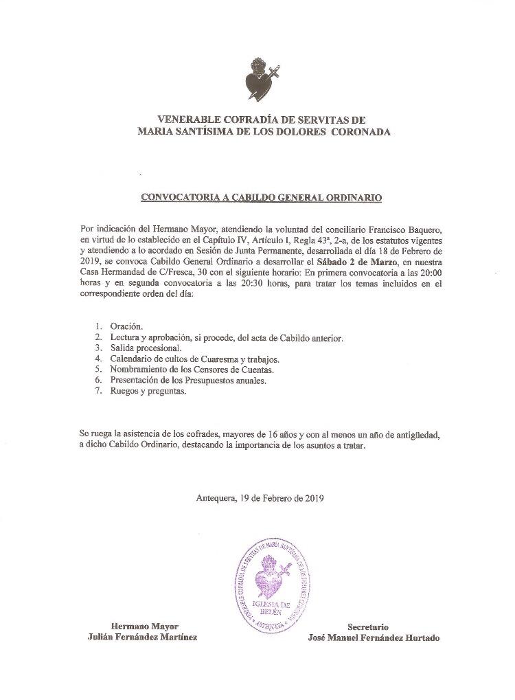 La convocatoria está establecida a las 20.00 horas en primera convocatoria y a las 20.30 horas en segunda con el siguiente orden del día: Oración, lectura y aprobación si procede del acta del Cabildo anterior, salida procesional, calendario de cultos de Cuaresma y trabajos, nombramiento de los censores de cuentas, presentación de los presupuestos anuales, así como ruegos y preguntas.