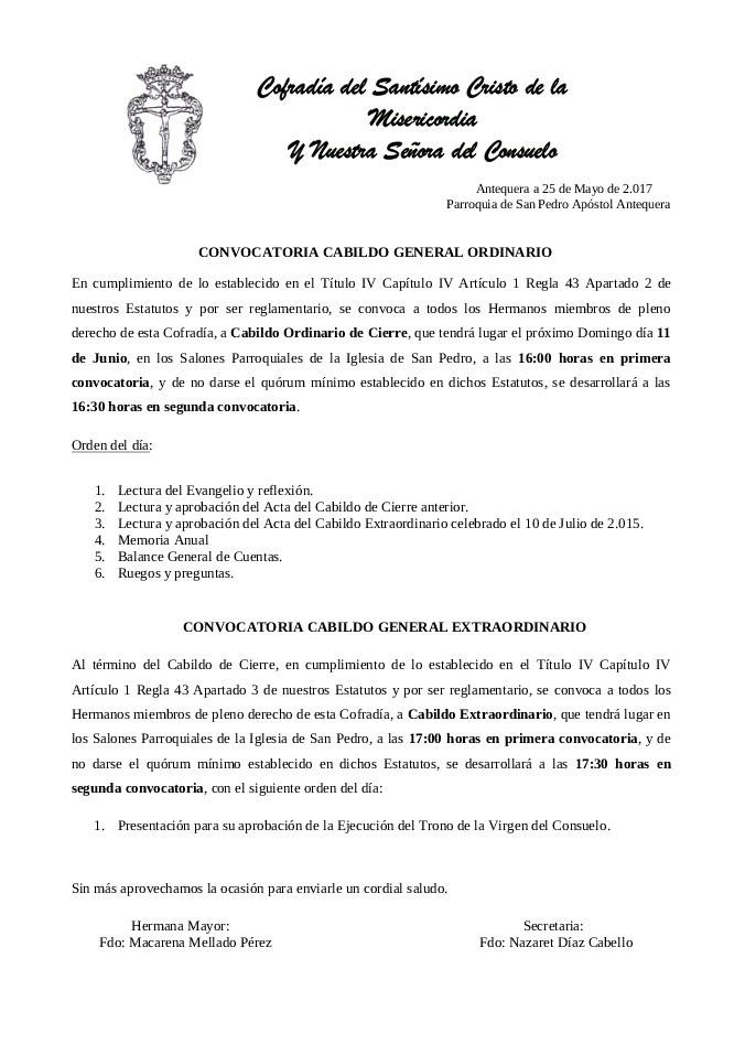 La Cofradía del Santísimo Cristo de la Misericordia y Nuestra Señora del Consuelo de Antequera en cumplimiento de lo establecido en el titulo 4, capitulo 4, articulo 1, regla 43, apartado 2 de sus Estatutos y por ser reglamentario convoca a todos sus hermanos miembros de pleno derecho a Cabildo Ordinario de Cierre el próximo domingo 11 de junio en los salones parroquiales de la Iglesia de San Pedro, a las 16.00 horas en primera convocatoria y a las 16.30 horas en segunda en caso de no darse el quórum minimo establecido en Estatutos. El orden del día será el siguiente: