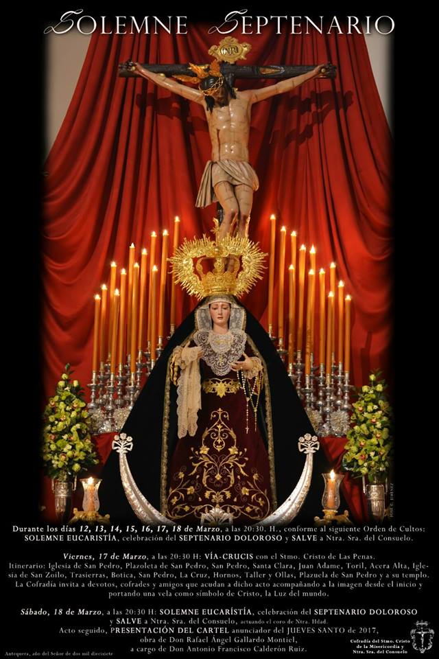 La Cofradía del Santísimo Cristo de la Misericordia y Nuestra Señora del Consuelo de Antequera organiza su Septenario de Cuaresma la ocho y media de la tarde desde el domingo día 12 al Sábado día 18. Finalizando este, con la presentación del cartel anunciador de su Jueves Santo de 2017.