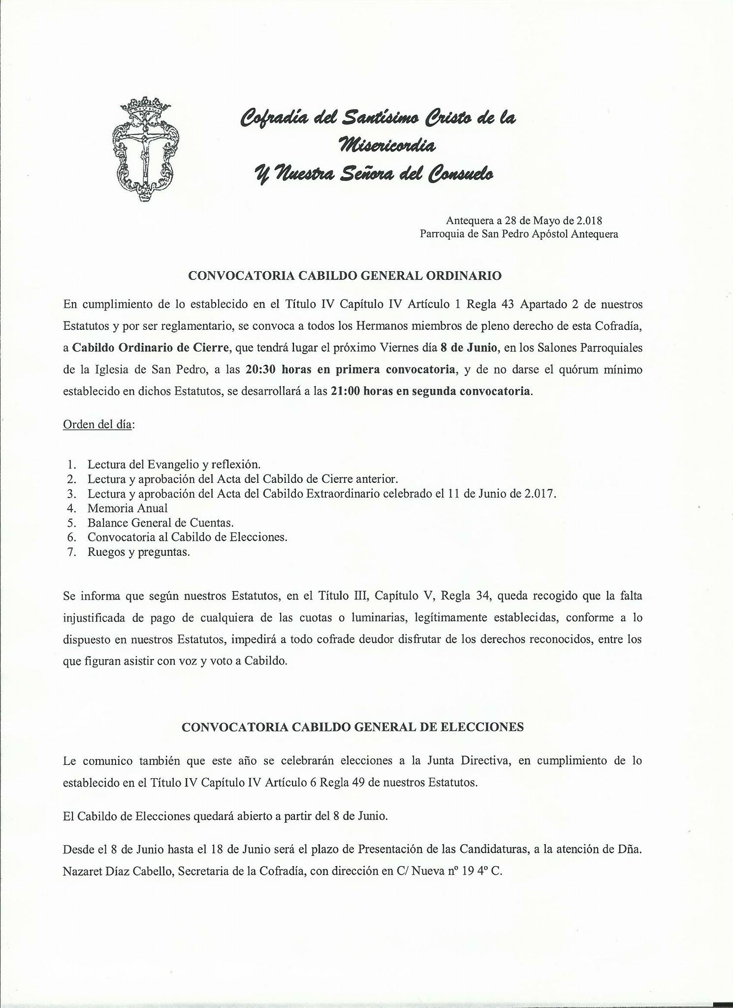 La Cofradía del Santísimo Cristo de la Misericordia y Nuestra Señora del Consuelo de Antequera en cumplimento de lo establecido en el titulo cuarto, capitulo cuatro, articulo primero, regla 43 apartado 2 de sus Estatutos, convoca a todos sus Hermanos a Cabildo Ordinario de Cierre, que tendrá lugar el próximo viernes 8 de junio en los salones parroquiales de la iglesia de San Pedro, a las 20.30 horas en primera convocatoria y de no darse el quórum mínimo establecido en dichos estatutos se desarrollará a las 21.00 horas en segunda convocatoria.