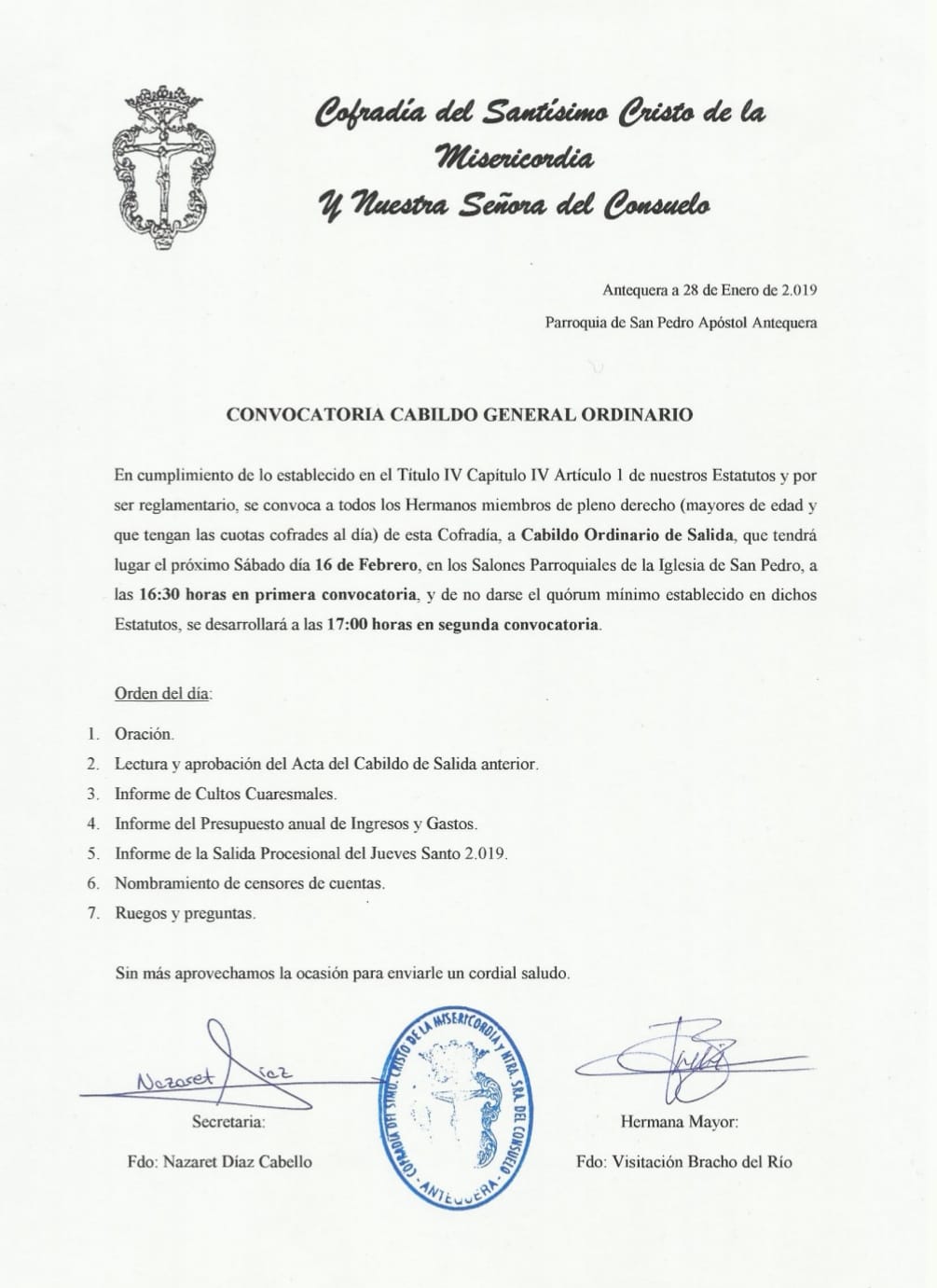 La Cofradía del Santísimo Cristo de la Misericordia y Nuestra Señora del Consuelo de Antequera convoca a cabildo General Ordinario a todos sus hermanos miembros de pleno derecho de esta Cofradía.