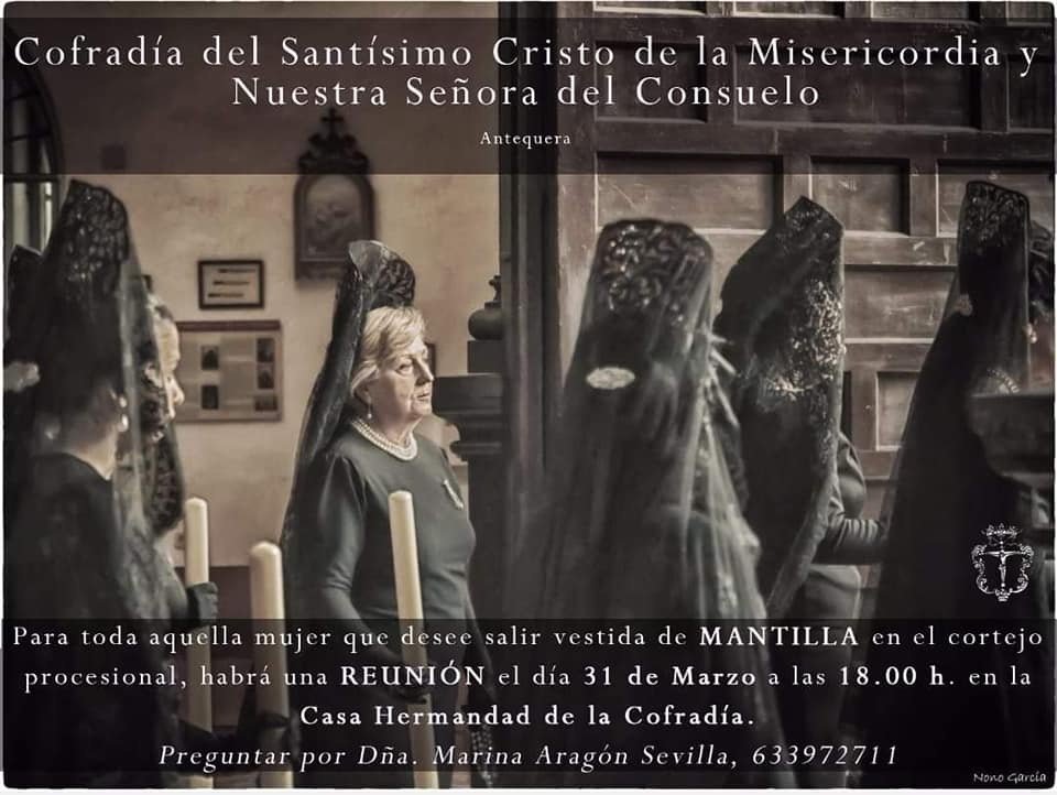 La Cofradía del Santísimo Cristo de la Misericordia y Nuestra Señora del Consuelo de Antequera organiza reunión de mantillas el próximo domingo 31 de marzo a las 18.00 horas en la Casa Hermandad de la Cofradía. Para inscribirse o cualquier duda pueden preguntar por Marina Aragón al teléfono 633972711