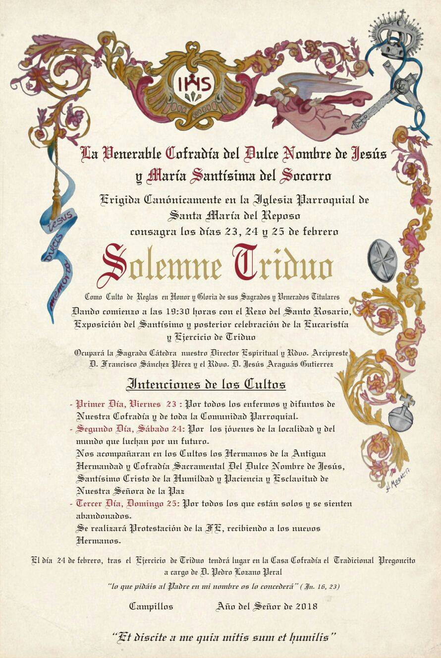 La Venerable Cofradía del Dulce Nombre de Jesús y María Santísima del Socorro de Campillos organiza en su Casa Hermandad (debido a los trabajos de restauración en la iglesia parroquial de Santa María del Reposo) Solemne Triduo a sus Sagrados Titulares los próximos viernes 23, sábado 24 y domingo 25 de febrero.