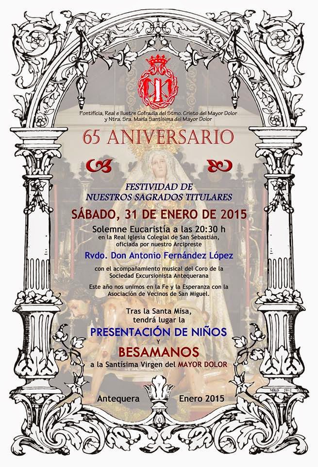 La Cofradía del Mayor Dolor de Antequera inicia su 65 Aniversario coincidiendo con la Festividad de sus Sagrados Titulares. Una celebración que tendrá lugar este próximo sábado 31 de Enero a partir de las 20.30 horas.
