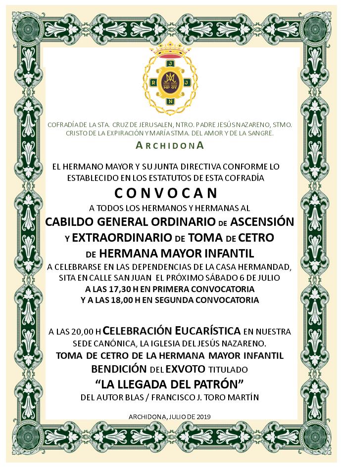 La Cofradía de Nuestro Padre Jesús Nazareno de Archidona convoca a todos sus hermanos a Cabildo General Ordinario de Ascensión y Extraordinario de toma de cetro de hermana mayor infantil, que tendrá lugar este sábado 6 de julio a las 17.30 horas en primera convocatoria y a las 18.00 hora en segunda en las dependencias de su Casa Hermandad en Calle San Juan.