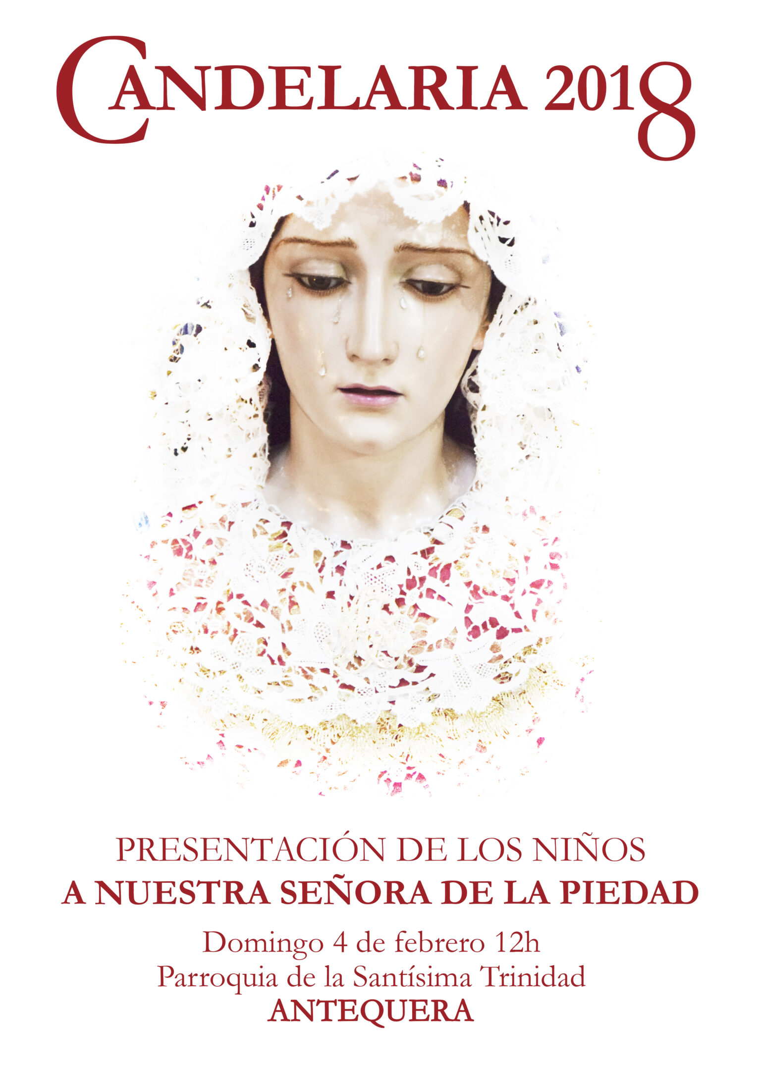 La Cofradía de Nuestro Padre Jesús del Rescate y María Santísima de la Piedad de Antequera celebrará, como cada año, la festividad de la Candelaria con la presentación de los niños a la Virgen de la Piedad, el próximo domingo 4 de febrero en la Eucaristía que celebra la parroquia de la Santísima Trinidad a las 12 del mediodía.
