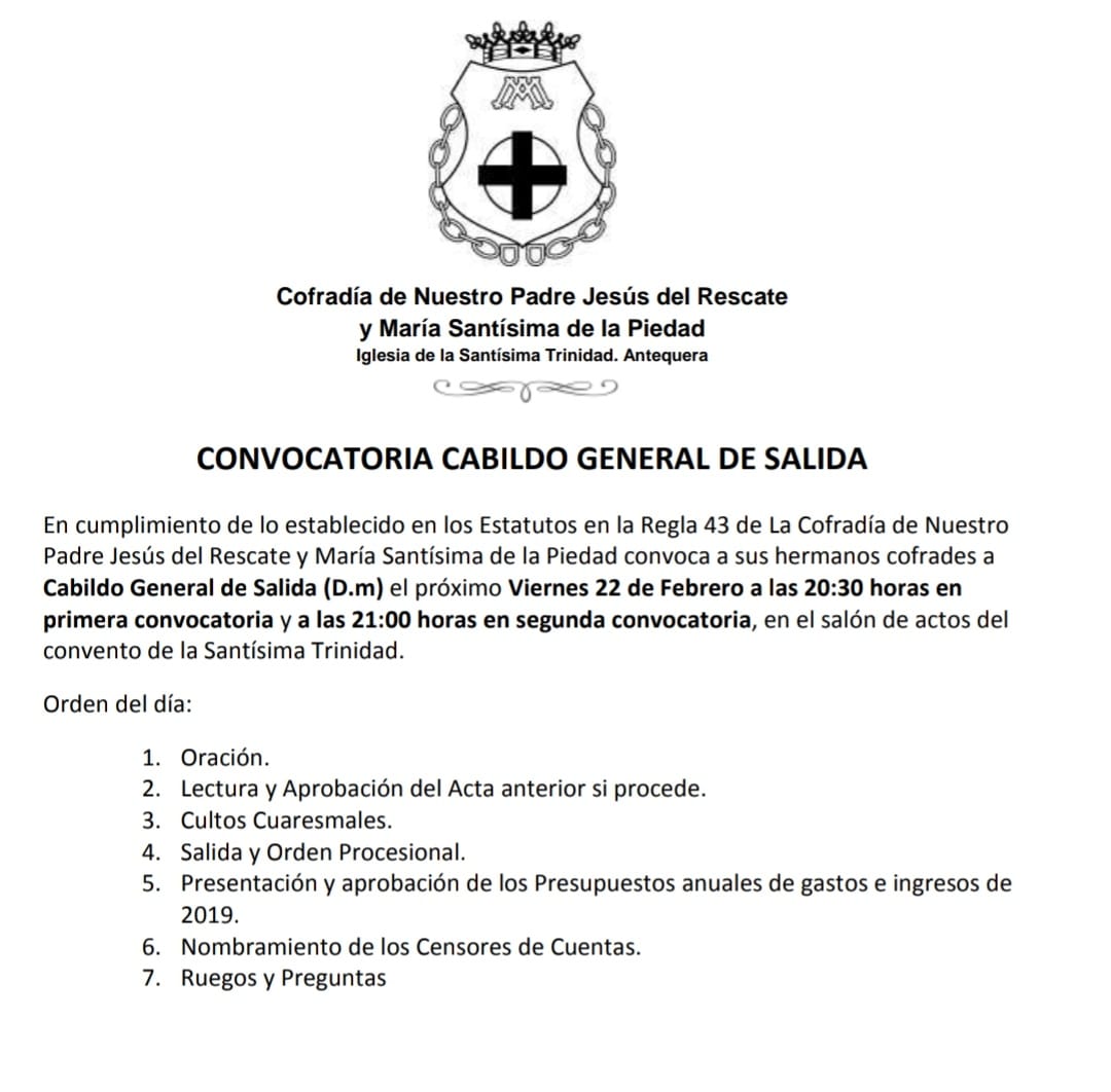 La Cofradía de Nuestro Padre Jesús del Rescate y María Santísima de la Piedad de Antequera en cumplimiento con sus Estatutos convoca a sus hermanos cofrades a Cabildo General de Salida el próximo viernes 22 de febrero a las 20.30 horas en primera convocatoria y a las 21.00 horas en segunda en el salón de actos del Convento de la Santísima Trinidad.