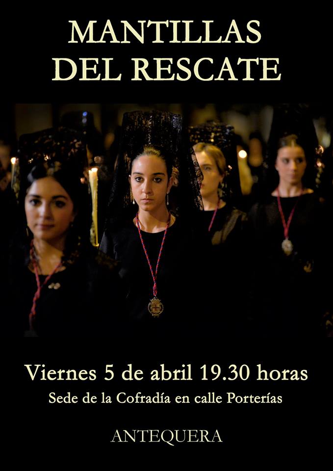 La Cofradía de Nuestro Padre Jesús del Rescate y María Santísima de la Piedad de Antequera convoca a sus mantillas a reunión previa al Martes Santo de 2019 el próximo viernes 5 de abril a las 19.30 horas en su sede social de calle Porterías.