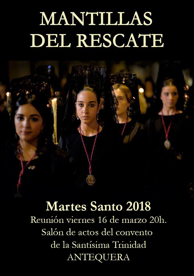 La Cofradía del Rescate de Antequera convoca a las mujeres que deseen acompañar a nuestro Padre Jesús del Rescate y María Santísima de la Piedad ataviadas de mantilla española el próximo Martes Santo a la reunión que tendrá lugar el viernes 16 de marzo a las 20.00 horas en el salón de actos del convento de la Santísima Trinidad de Antequera.