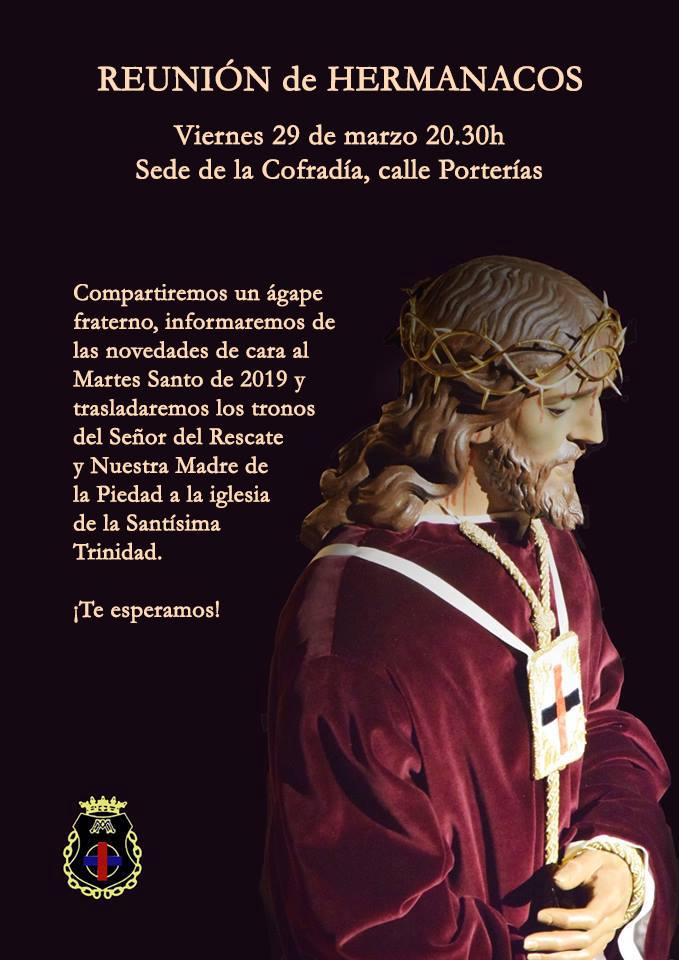 La Cofradía de Nuestro Padre Jesús del Rescate y María Santísima de la Piedad convoca a sus hermanacos y hermanacas a reunión previa al Martes Santo el próximo viernes 29 de marzo a partir de las 20.30 horas en su sede social situada en calle Porterías.