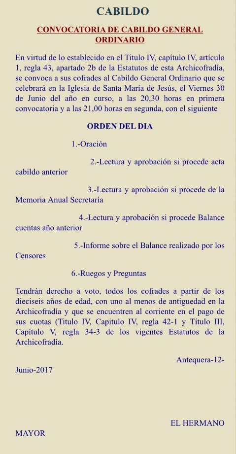 En virtud de los establecido en el título IV, capítulo IV, articulo 1, regla 43, apartado 2b de los Estatutos de la Archicofradía, convocan a todos sus cofrades al Cabildo General Ordinario que se celebrará en la Iglesia de Santa María de Jesús, el viernes 30 de junio, a las 20.30 en primera convocatoria y a las 21.00 horas, en segunda, con el siguiente orden del día: