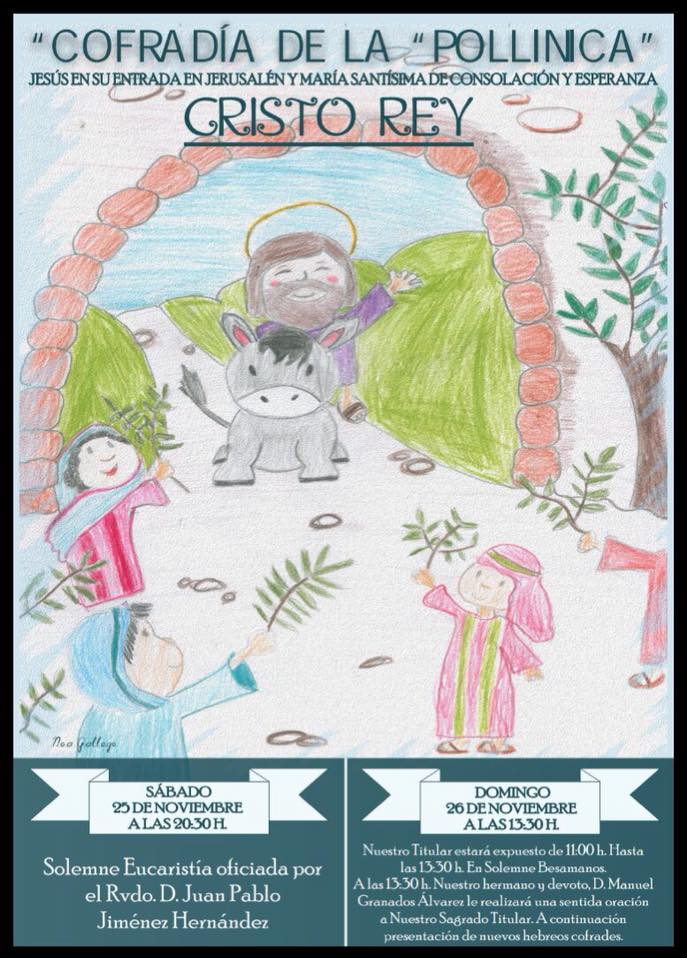 La Cofradía de la Pollinica anuncia en cartel la próxima Festividad de Cristo Rey. Se trata de un dibujo realizado por Noa Gallego, ganadora del concurso y alumna de tercero de Educación Primaria en el CEIP Reina Sofía de Antequera.