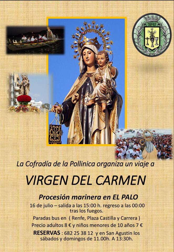 La Cofradia de la Pollinica de Antequera organiza viaje. En esta ocasión, se desplazaran a la playa del Palo en la ciudad de Málaga para disfrutar de la impresionante procesión marinera el  domingo 16 de julio. Saldrán a las 15.00h y regresarán tras los fuegos artificiales sobre las doce de la noche.
