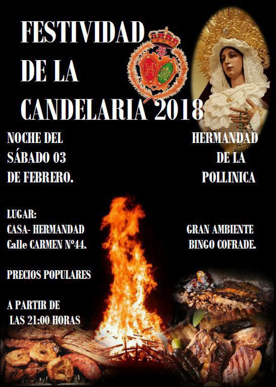 La Cofradía de la Pollinica de Campillos prepara una gran noche para celebrar la festividad de la Candelaria, en su casa Hermandad, este sábado 03 de Febrero a partir de las 21:00 horas.