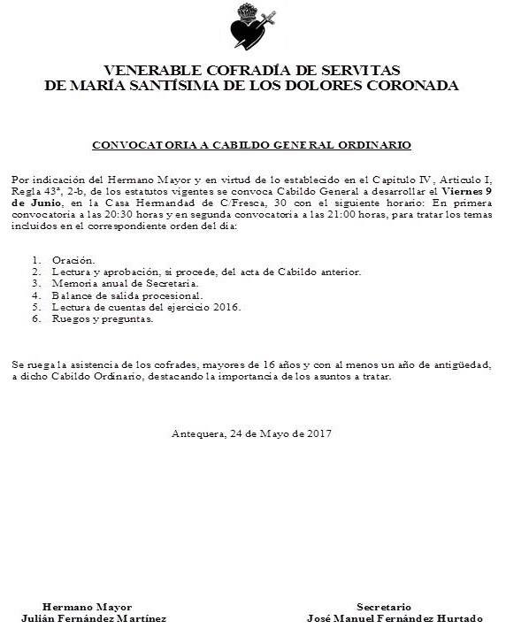 La Venerable Cofradia de Servitas de María Santísima de los Dolores Coronada por indicación de su Hermano Mayor convoca Cabildo General en virtud de lo establecido en el capitulo 4, articulo 1, regla 43, 2B de sus Estatutos para el próximo viernes 9 de junio.