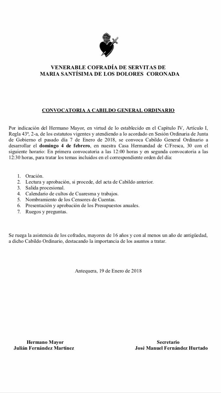 La Cofradía de Servitas de María Santísima de los Dolores de Antequera convoca a sus hermanos a Cabildo general ordinario para el próximo domingo 4 de febrero.