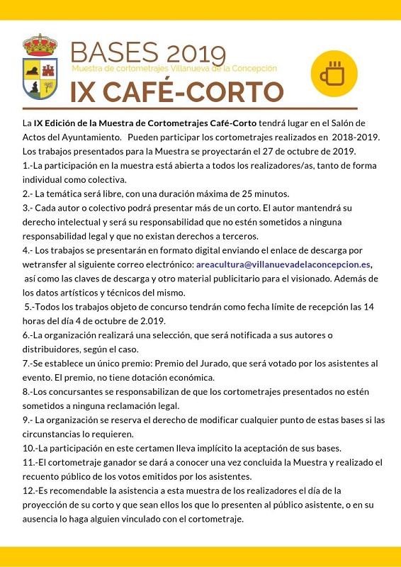 Este año la celebración de la novena edición de la ya tradicional ‘Muestra de Cortometrajes Café-Corto’ de Villanueva de la Concepción tendrá lugar el próximo 27 de octubre. El acto se llevará a cabo en el Salón de Actos del Ayuntamiento, como ya es habitual.