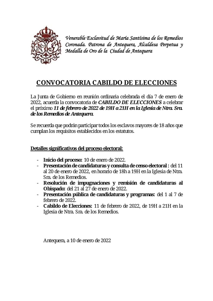 La Venerable Esclavitud de Nuestra Señora de los Remedios, Patrona Mariana de Antequera ha anunciado que la Junta de Gobierno, a través de una reunión ordinaria celebrada el pasado siete de enero, ha acordado la convocatoria de un Cabildo de Elecciones que tendrá lugar el próximo 11 de febrero, en horario de siete a nueve, en la Iglesia de Los Remedios.