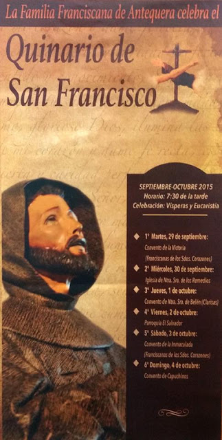 La Familia Franciscana de Antequera celebra el Quinario de San Francisco. Tendrá lugar del Martes 29 de Septiembre al Domingo 4 de Octubre a las siete y media de la tarde con el rezo de las Vísperas y posterior celebración de la Eucaristía. Siendo el orden de cultos en el siguiente rosario de templos de la ciudad: