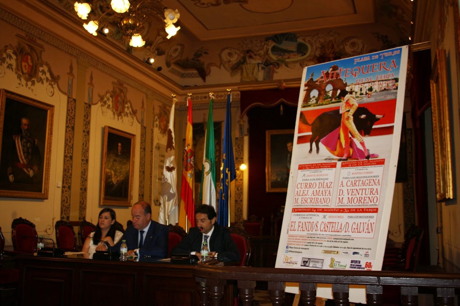 La presentación del cartel de toros para la feria de Agosto 2014 ha tenido lugar esta mañana en el ayuntamiento de Antequera. La presentación estuvo a cargo del alcalde de la ciudad, Manuel Barón, el responsable de espectáculos taurinos de la plaza de toros de Antequera, José Luis Lara, y la responsable de todo lo concerniente a la feria de agosto, la concejal de cultura, festejos y comunicación, Ana Cebrián.