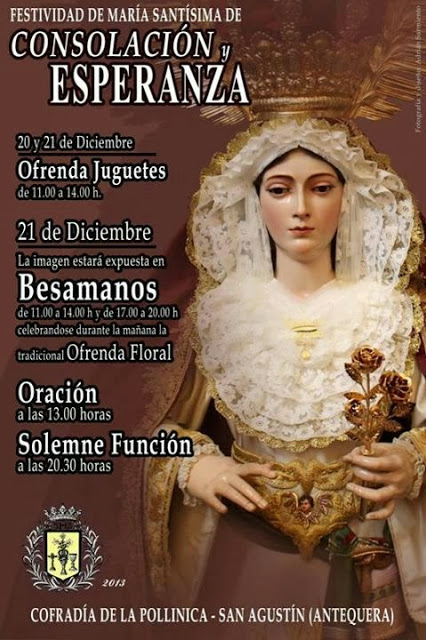 La Hermandad del Domingo de Ramos antequerano ha preparado diversos actos con motivo de su titular mariana aprovechando la ocasión para desarrollar también campaña solidaria. Por lo que durante el viernes 20 y el sábado 21, la Iglesia de San Agustín, sede de esta Cofradía, estará abierta de once de la mañana a dos de la tarde, sumandose a la Campaña Navideña «Ningún niño sin juguete» organizada por la A.C.I.A y la plataforma del Voluntariado de la comarca de Antequera.
