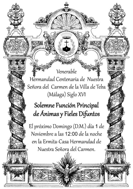 La Venerable Hermandad Centenaria de Nuestra Señora del Carmen de Teba, organiza Función Principal de Ánimas y Fieles Difuntos, la cual tendrá lugar este domingo 1 de noviembre, a las doce de la noche en la Ermita-Casa Hermandad de Nuestra Señora del Carmen, a la luz de las velas.