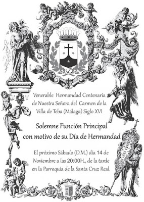 La Venerable Hermandad Centenaria de Nuestra Señora del Carmen de Teba organiza Solemne Función Principal con motivo de su Día de Hermandad que tendrá lugar este sábado 14 de Noviembre a las ocho de la tarde en la Parroquia de la Santa Cruz Real de Teba.