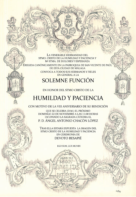 El domingo 22 de noviembre a las 11:00 horas en la Parroquia de San Vicente de Paúl, tendrá lugar la Solemne Festividad de Jesucristo, Rey del Universo y festividad del Sagrado Titular, el Santísimo Cristo de la Humildad y Paciencia, a la vez que se conmemorara el Octavo Aniversario de su Bendición. Tras la función la imagen quedará expuesta en devoto besapies.
