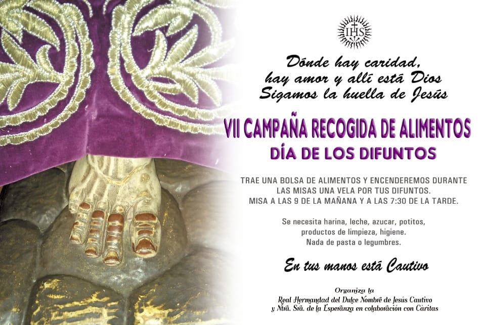 La Real Hermandad del Dulce Nombre de Jesús Cautivo y Nuestra Señora de la Esperanza de Cuevas de San Marcos en colaboración con Cáritas organiza su Sexta Campaña de Recogida de alimentos con motivo del dia de los Fieles Difuntos el próximo viernes 2 de noviembre.