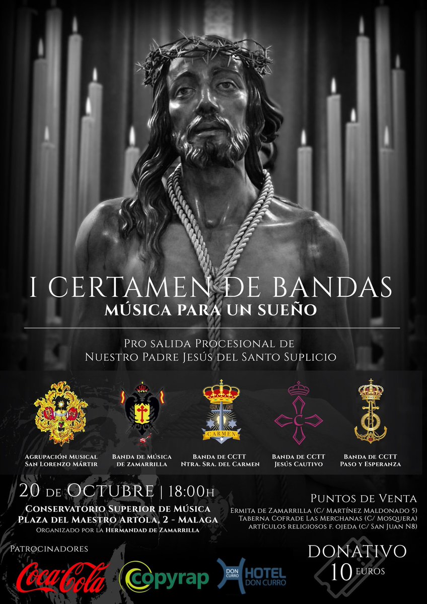 La Hermandad de Zamarrilla organiza para el próximo sábado 20 de octubre a las 18.00 horas el primer certamen de bandas “Musica para un sueño” para el proyecto de la futura salida procesional de Nuestro Padre Jesús del Santo Suplicio.
