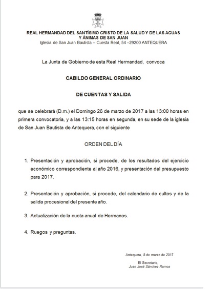 La Junta de Gobierno de la Real Hermandad del Santísimo Cristo de la Salud y de las Aguas y Ánimas de San Juan convoca su Cabildo General Ordinario de Cuentas y Salida, que se celebrará (D.m.) el Domingo 26 de marzo de 2017 a las 13:00 horas en primera convocatoria, y a las 13:15 horas en segunda, en su sede de la iglesia de San Juan Bautista de Antequera, con el siguiente