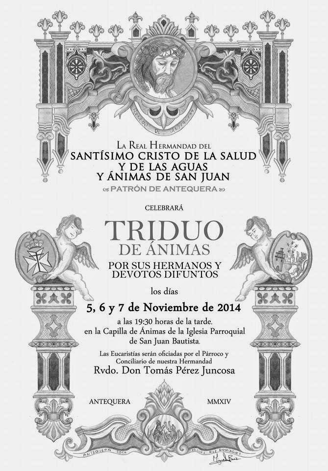 La Hermandad del Patrón de Antequera, el Cristo de la Salud y de las Aguas y Ánimas de San Juan organiza triduo de Ánimas por sus hermanos y devotos difuntos. Dichas funciones religiosas darán inicio este miércoles 5 de Noviembre y se prolongaran hasta el viernes día 7.